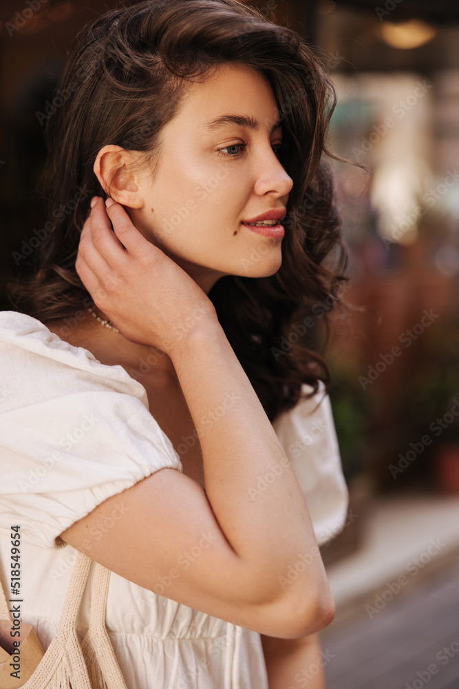 Cute caucasian young girl looks away while relaxing outdoors. Brunette with wavy hair wears casual dress in summer. Relaxation concept