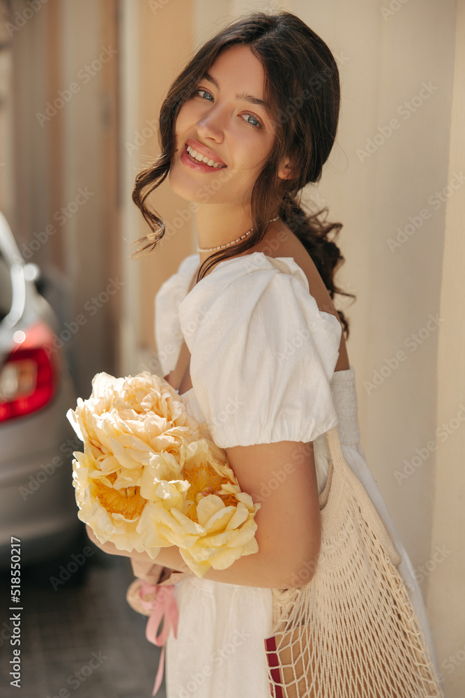 Attractive caucasian young woman happily walks with flowers on city street day. Brunette wears stylish white sundress in summer. Fashion trends concept