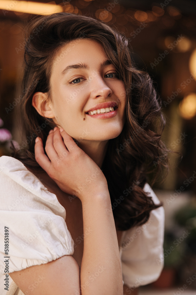 Sweet young caucasian girl smiling looking at camera spending leisure time outdoors. Brunette with wavy hair is wearing white dress. People emotions, lifestyle and fashion concept.