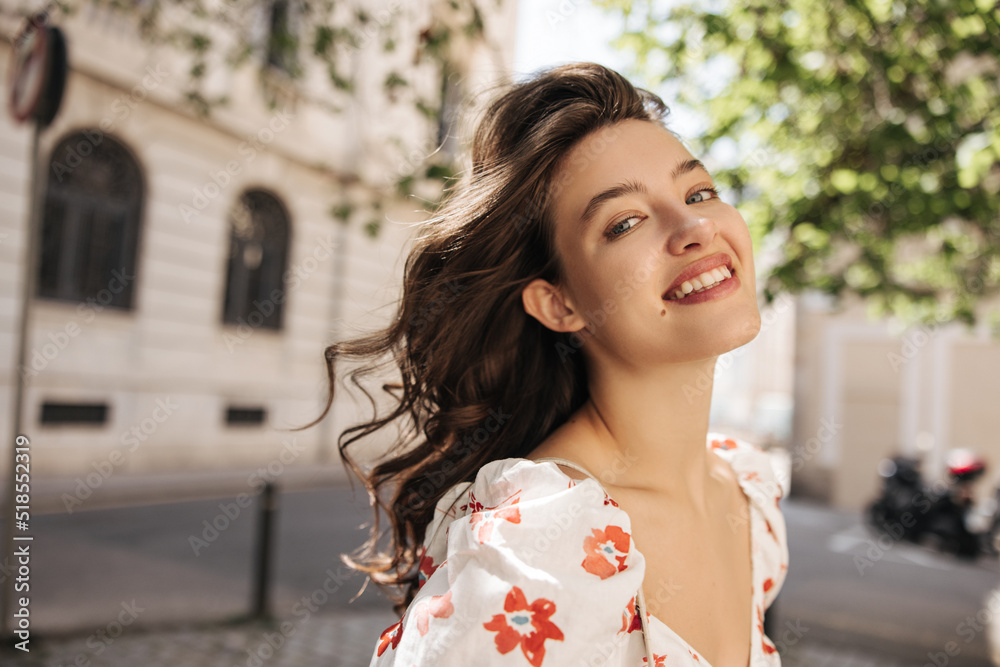 Close up of positive young caucasian girl smiling relaxing outdoors during day. Brunette with wavy hair wears casual blouse. Lifestyle, female beauty concept