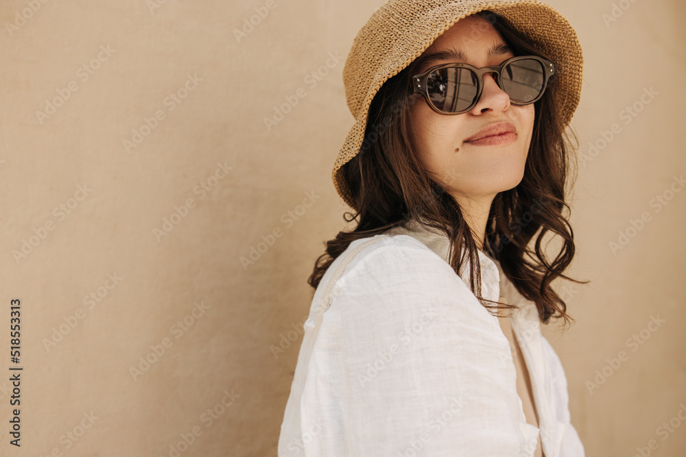 Modern young caucasian lady posing against backdrop of city wall on sunny day. Brunette with wavy hair wears panama hat, sunglasses and white shirt. Lifestyle concept