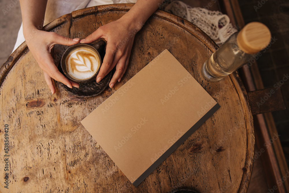 Top view of table in street cafe with female caucasian hands, cup of coffee, bottle of water and notebook. Concept modern lifestyle