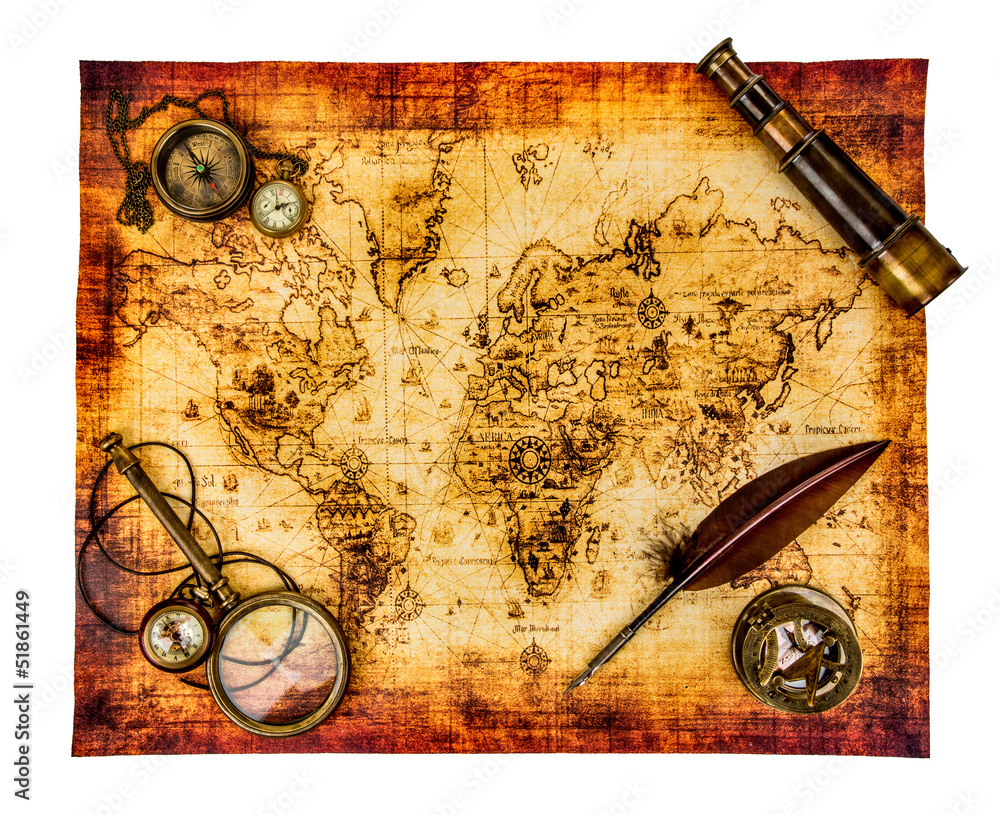 Vintage still life. Ancient world map isolated on white.