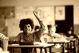 Happy African American kid raising his arm to ask question during class at elementary school.