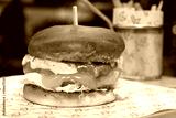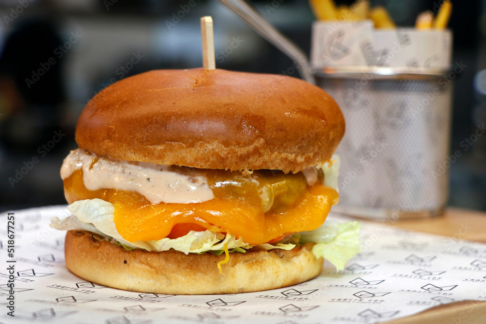 angus beef burger with mushroom, cheese, tomatoes,eggs and lettuce in close up