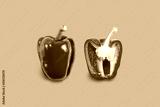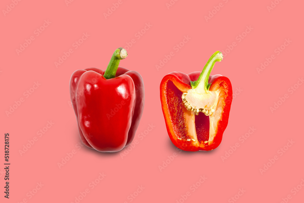 Slice and whole red bell peppers isolated on a pastel pink color background with a clipping path.