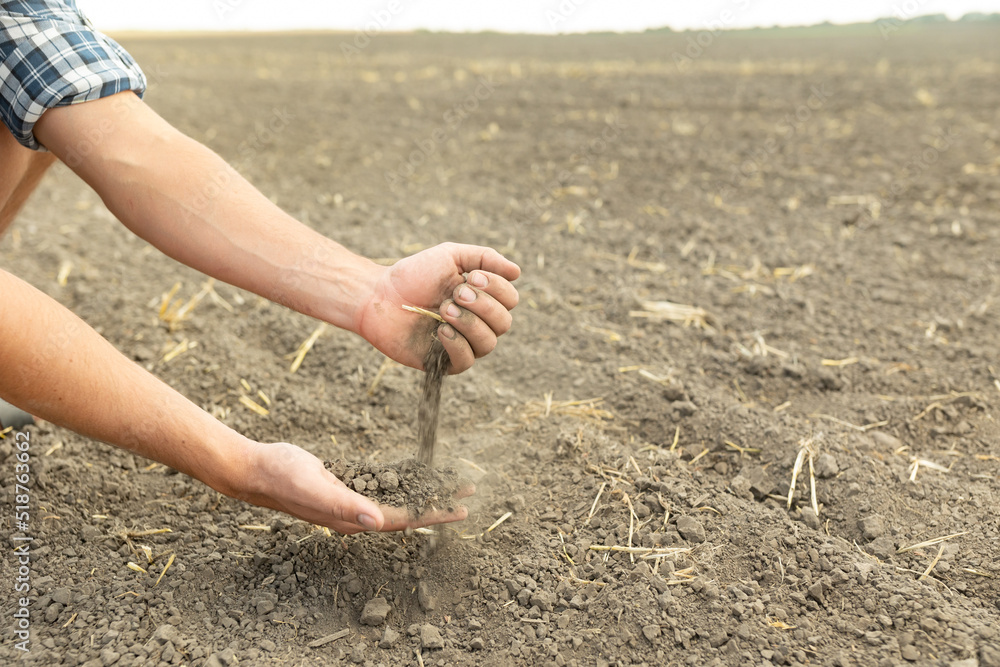 The farmer's hands hold a handful of fertile soil and pour it into the other hand. The concept of agriculture, agribusiness. The gardener holds fertilized earth in his palms.