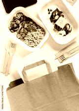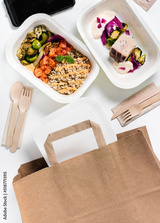 Collection of white plastic take away boxes with healthy food. Set of containers with everyday meals - meat, vegetables and law fat snacks on white background . wooden cutlery and a paper bag
