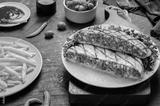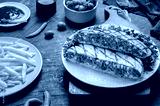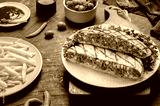 Arabic cuisine; Traditional Egyptian food "Hawawshi". It's flat Egyptian bread stuffed with minced meat and spiced with onions, peppers and chilies. Served with tahini, French fries and pickles.