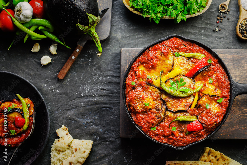 Arabic cuisine; Egyptian traditional food Moussaka. It contains fried eggplant(aubergine),colored bell peppers,chill peppers and garlic tomato sauce.Served with pita bread. Top view with close-up.