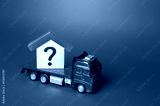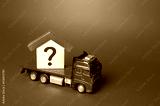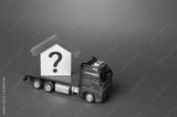 House with a question mark on a truck. House moving and relocation. Solving housing problems, buy real estate. Search for new living options. Property price valuation evaluation. Cost estimate.
