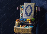 Islamic Holy Book "Quran" surrounded with light rays and placed with rosary beads, fresh dates, tulip flowers and prayer rug on wooden chair. Islamic concept. Ramadan background with copy space.