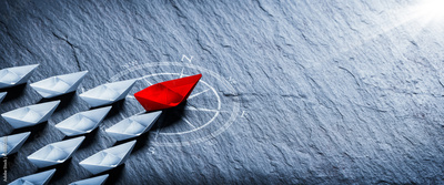 Red Paper Boat On Compass Leading A Fleet Of Small White Boats - Business Leadership Concept
