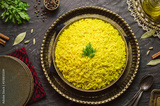 Arabic cuisine; Traditional plain Basmati rice. Topped with fresh parsley. Close up with copy space