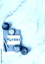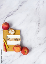 notepad, pencils, book and apples on marble background. august month concept. seasonal composition, minimal style. top view