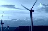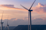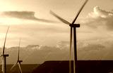 Wind energy. Wind power. Sustainable, renewable energy. Wind turbines generate electricity. Windmill farm on a mountain with sunset sky. Green technology. Renewable resource. Sustainable development.