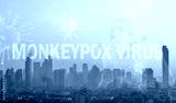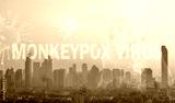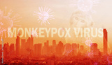 Monkeypox outbreak concept. Monkeypox is caused by monkeypox virus. Monkeypox outbreak prevention, management, and control of the city concept. Cityscape, monkey, and monkey pox virus background.