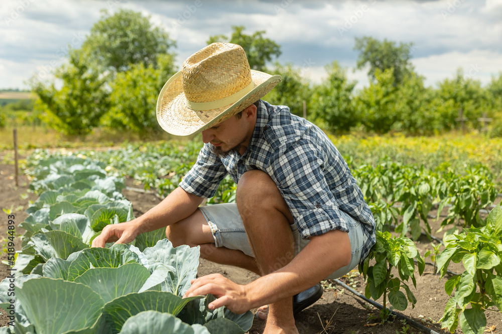 Farmer man engaged in cultivation of organic vegetables, checking cabbage