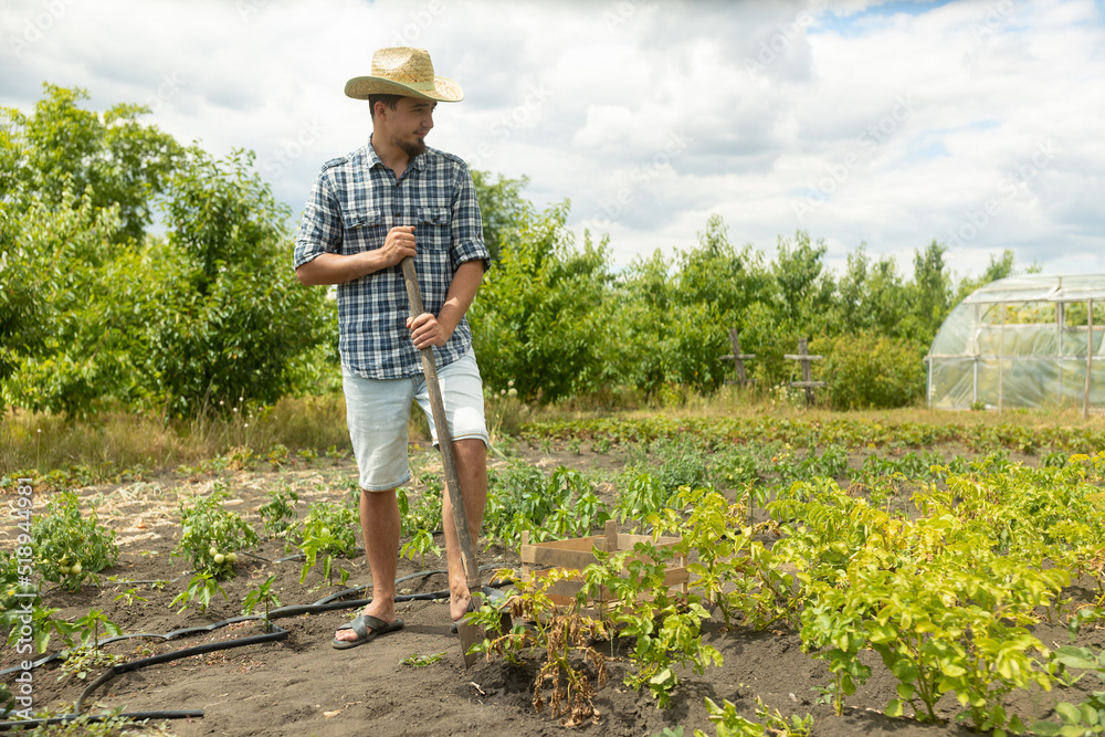 A farmer man in the hat digs up a potato with a shovel