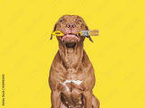 Lovable, pretty brown puppy and paintbrush. Close-up, indoors. Studio photo. Congratulations for family, relatives, loved ones, friends and colleagues. Pet care concept