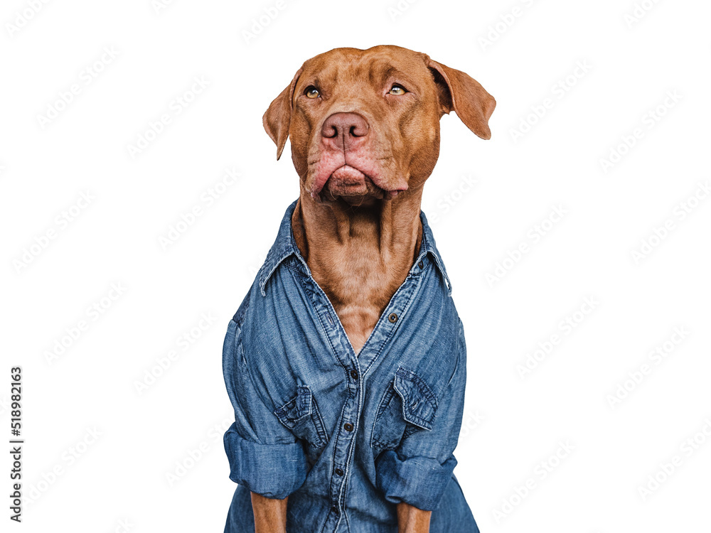 Lovable, pretty dog and denim shirt. Close-up, indoors. Studio photo. Pets care concept