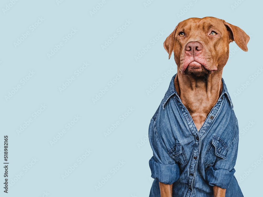 Lovable, pretty dog and denim shirt. Close-up, indoors. Studio photo. Pets care concept