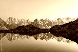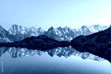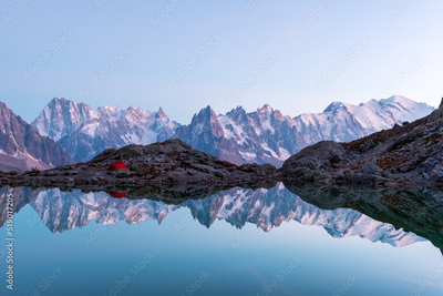 Red tent on Lac Blanc lake coast in France Alps. Monte Bianco mountains range on background. Landscape photography, Chamonix.