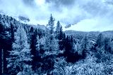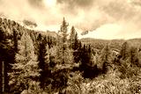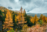 Incredible autumn view at Italian Dolomite Alps. Orange larches forest and foggy mountains peaks on background. Dolomites, Italy. Landscape photography