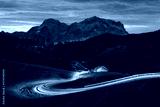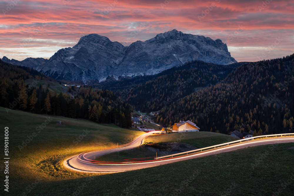 Glowing road at the autumn Dolomite Alps. Amazing landscape with lighting road and snowy mountains on background at San Genesio village location, Province of Bolzano, South Tyrol, Italy