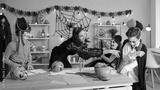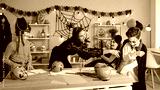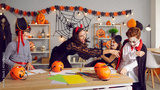 Overjoyed young teacher and kids dressed in costumes engaged in learning activity on Halloween eve. Happy nanny have fun play with kids celebrate scary all saint eve in school or kindergarten.