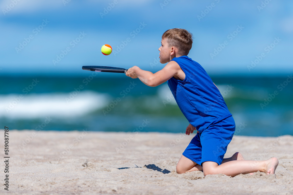 Young boy playing tennis on beach. Kids sport concept. Horizontal sport theme poster, greeting cards, headers, website and app