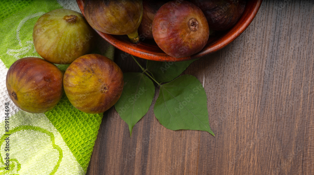 Freshly ripe figs. Healthy Mediterranean fig fruit. Fresh figs on a dark background. Beautiful blue violet figs with leaves, copy space, closeup