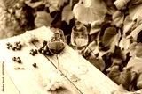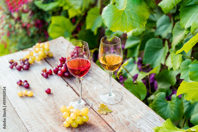 Glasses with white and red wine and grape berries on the wooden table in the vineyards, winery with green leaves background. Wine tasting, Degustation. Selective focus, Copy space