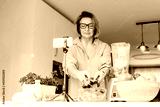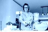 Middle age women is blogging for her wellness lifestyle channel about healthy balanced living in the kitchen of her home. Creating video content for social media with phone camera on a tripod