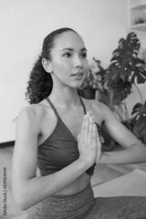 A young multi-racial woman sits in prayer pose with her eyes open at home