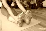 Close up of feet while young multi-ethnic woman stretches on yoga mat