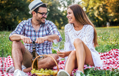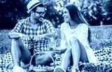 Loving couple enjoying picnic in the park. Love and tenderness, romance, lifestyle concept