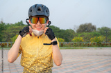 Young Asian cyclist woman smiling after taking off a mask while riding a bicycle outdoor.