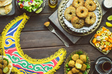 Traditional Falafel dish. Varieties of fresh vegetarian Falafel patties served with green salad, pickles, pita bread, tahini sauce, lemon and cup of tea with mint.