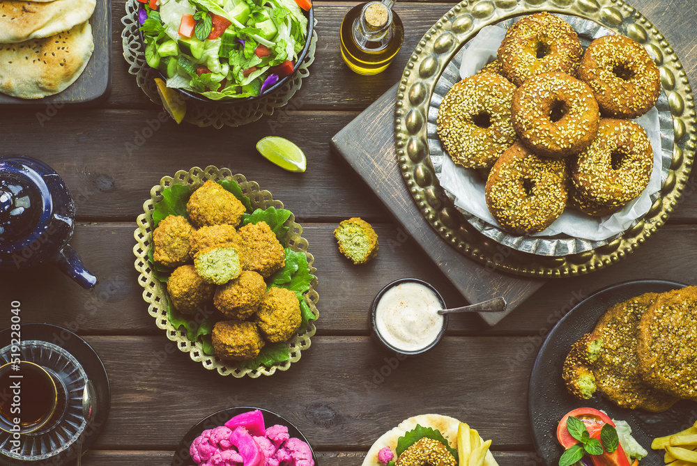 traditional Falafel dish. Varieties of fresh vegetarian Falafel patties served with green salad, pickles, pita bread, tahini sauce, lemon and cup of tea with mint.