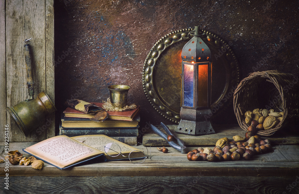 Classic still life with illuminated old lamp placed with vintage books, basket of nuts, hot coffee, old copper tray and antique glasses on rustic wooden background.