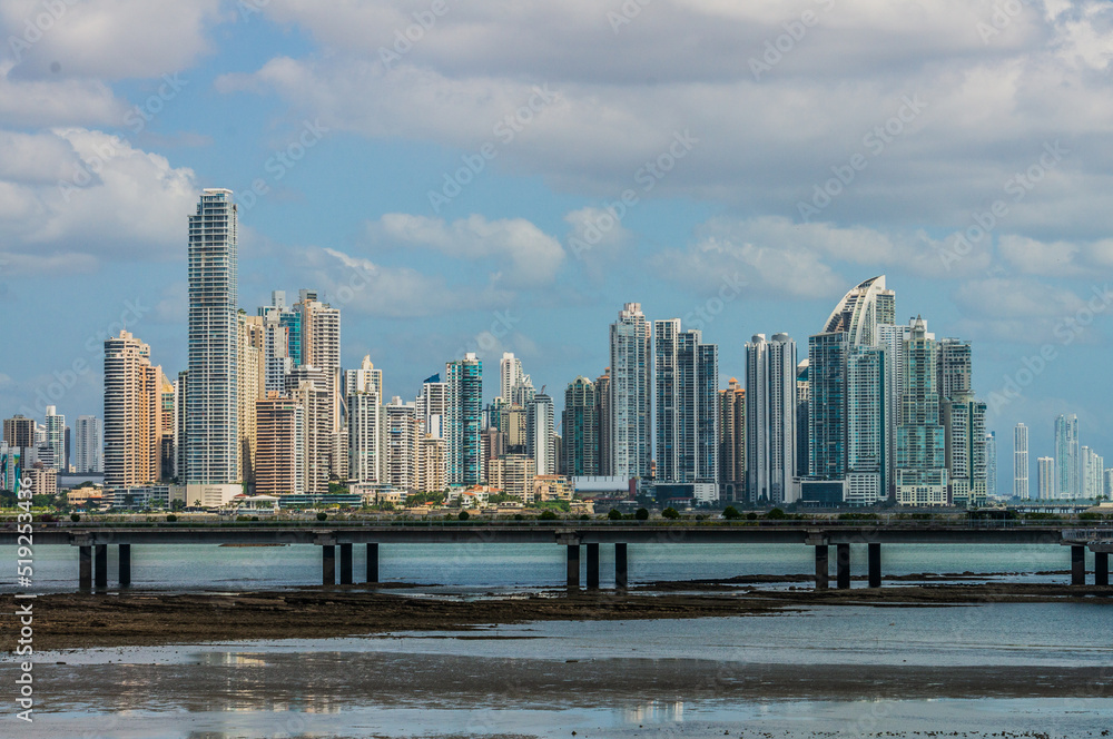 Skyscraper line city landscape of Panama City seen from the marine viaduct