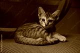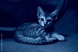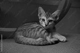 Little cute brown cat laying on office chair. Lovely kitten looking at camera.