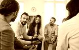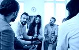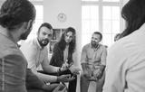 Different men and women at support group meeting listen to young man talking about himself. People sit in circle while talking and listening to each other's stories. Concept of group therapy.