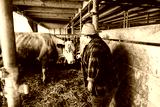 Young curvy farmer woman stroking cow in the cowshed - Focus on woman face