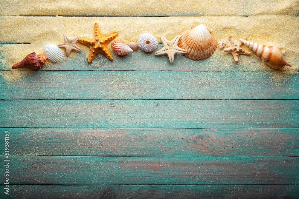 Vacations and summer time concept with starfish and sea shells on a turquoise wooden table with sand