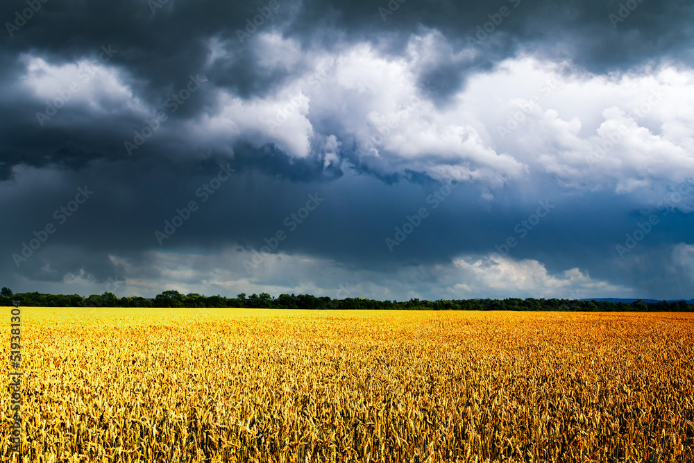 Ripe wheat spikelets on golden field infront dramatic dark sky with rainy clouds. Industrial and nature landscape. Ukraine, Europe
