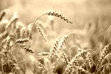 Ripe wheat spikelets on golden field glowing by the orange sunset light. Industrial and nature background. Ukraine, Europe