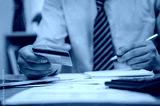 employee of a company paying a charge with a credit card while conducting internet shopping. Concept of tax and accounting in business.