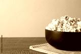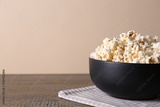 Delicious popcorn in bowl on wooden table. Space for text